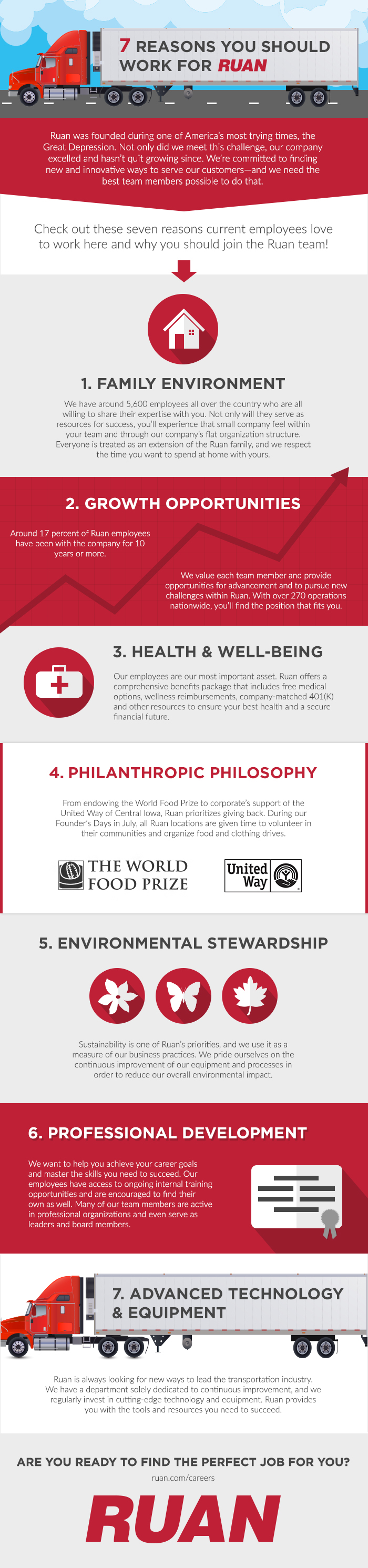 Ruan was founded during one of America's most trying times, the Great Depression. Not only did we meet this challenge, our company excelled and hasn't quit growing since. We're committed to finding new and innovative ways to serve our customers—and we need the best team members possible to do that.